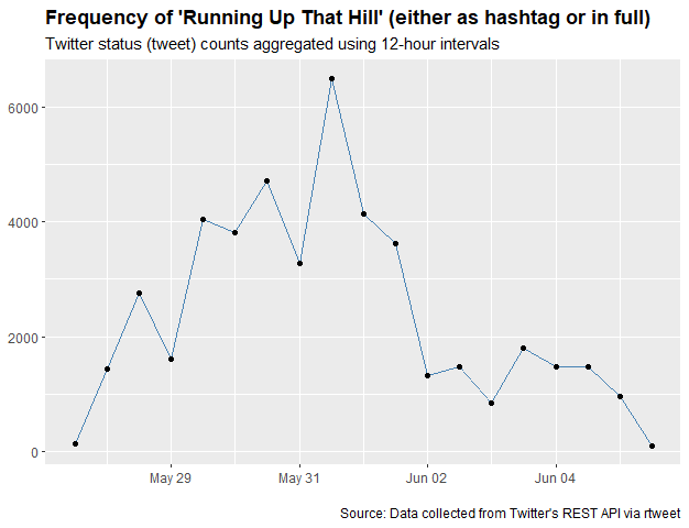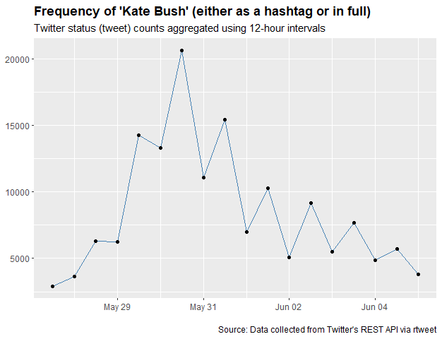 Within a week, TikTok videos carrying the #runningupthehill hashtag had racked up around 200M views. I analysed tweets in the last nine days that mentioned Kate Bush or the track (either spelled in full or in a hashtag format). On both cases, there were also an impressive increase in tweets around the release of this series in Netflix.