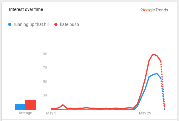 With the second installment of Season 4 due in July 1, I’m sure that this track and Kate Bush would get another boost in popularity. With a nudge in mental availability, there is also a likely effect in consumption through available channels as new and lapsed listeners would be drawn to enjoy her music.