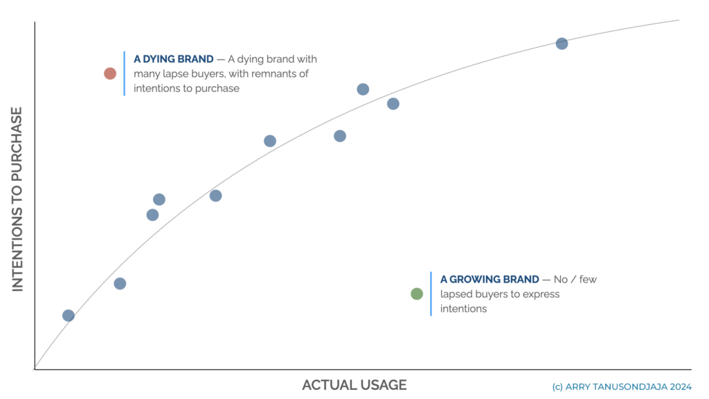 Bird and Ehrenberg argue that brands with lower usage and high purchase intentions are actually dying brands, because they carry many lapsed buyers who still express their intentions to purchase (although they don’t actually do!). On the contrary, brands with higher usage and low purchase intentions are most likely newer entrants with no or few lapsed buyers to express their intentions. As the brands grow bigger, they are likely to move closer to the expected level. An important point from this research is that actual usage leads to intentions — and not the other way around.